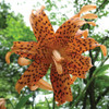 You’ll be seeing double with this double-flowered tiger lily. This variety has up to 36 petals arranged as turks’ caps within turks’ caps. The inner petals first poke straight out with a tentacle-like appearance, but slowly all the petals fold back in the classic turk’s cap pose. Lily lancifolium